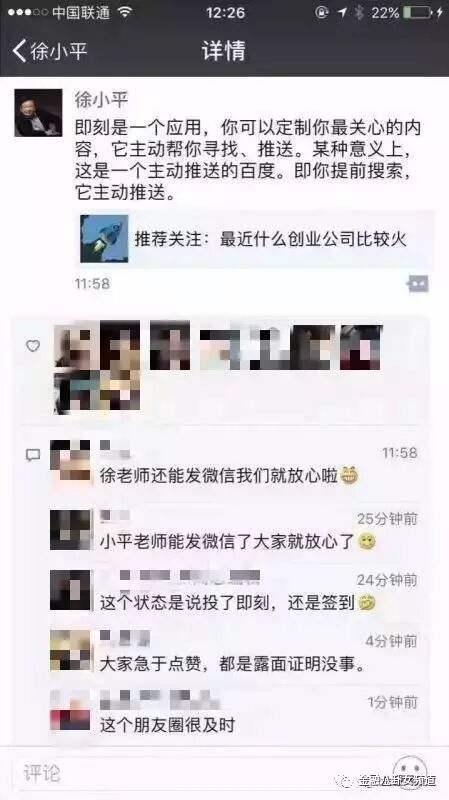 愛找美女創業者的徐小平老師果斷髮了朋友圈,還不忘推了一把產品,