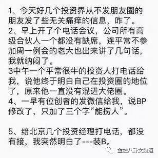 最後我們要恭喜一下正在創業的小明,他特別不容易,儘管項目不錯,見了幾十個投資人,但都被拒絕了,今天在某位同學的指點下,他在BP上寫了舅舅的名字,後面備註能撈人,現在他的電話還是正在通話中……