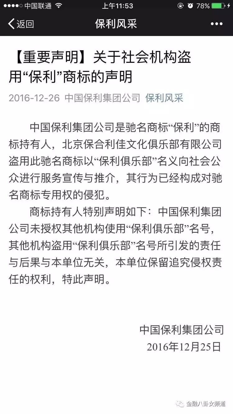 事發之後呢,保利集團發聲明否認保利俱樂部是他家開的: